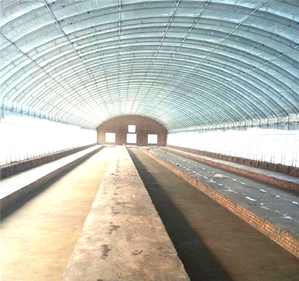 二、在养殖圈上搭建塑料暖棚。以木杆、高粱秸秆等支撑物作棚架,上边覆盖留有通气孔的塑料薄膜,而后将塑料薄膜四周用泥沙、草捆等压严,这样,可提高舍内温度,达到保暖防寒目的。