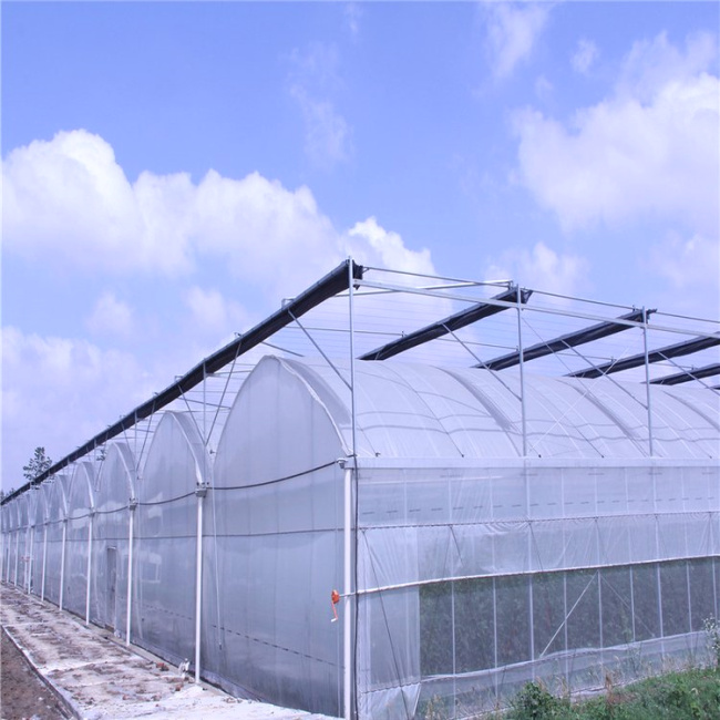 连栋薄膜温室主要是以薄膜作为覆盖材料的连栋温室。一栋完整的连栋薄膜温室主要包括温室土建基础部分、主体热镀锌钢骨架、外遮阳热镀锌钢骨架、覆盖材料、外遮阳系统、内保温系统、湿帘-风机降温系统、顶部及四周卷膜开窗系统、喷淋系统、配电系统、排水系统等。 连栋薄膜温室采用热镀锌钢制骨架、顶部及四周采用双层高保温长寿无滴塑料膜,四周也可采用国产聚碳酸酯板材料,是温室中一种简单的保温节能形式,它有保温性能良好、操作简便等优点,适合于花卉种植、种苗繁育、花卉市场、科研、教学等,是以后温室节能保温技术的一个发展应用方向。